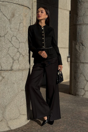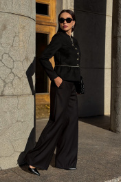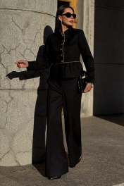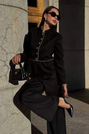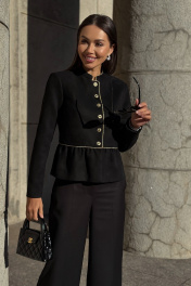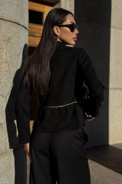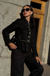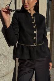 Женский чёрный замшевый жакет URS — воплощение элегантности, уверенности и изысканного вкуса. Эта модель создана для женщин, которые ценят стиль, комфорт и внимание к деталям. Жакет женский, нарядный, полуприлегающего силуэта из мягкой искусственной замши на трикотажной основе, отрезной по линии талии, с центральной бортовой застежкой от шва талии до верха на 6 петель и 6 пуговиц (размер и цвет фурнитуры может незначительно отличаться от фото). Верхняя часть переда с нагрудными вытачками от боковых швов. Верхняя часть спинки с рельефными швами, идущими от пройм вниз до шва талии. Нижняя часть переда и спинки двойная, со сгибом, со сборкой по шву талии. Верхняя часть переда и спинки, рукава на подкладке. Горловина оформлена воротником-стойкой. Рукава втачные, двухшовные, длинные. Воротник, борта, шов талии переда и спинки оформлен декоративной тесьмой. Жакет с плечевыми накладками. "42 размер Длина вдоль середины спинки от шва втачивания горловины до низа - 57,5 см (±2,0 см), Длина спинки до талии - 40,5 см (±1,0 см), Ширина на уровне глубины проймы - 46,5 см (±1,0 см), Ширина на уровне линии талии (по шву притачивания баски) - 42,0 см (±1,0 см), Длина рукава - 60,5 см (±1,0 см), Ширина рукава вверху - 16,5 см (±0,5 см), Ширина рукава по низу - 12,2 см (±0,5 см), Длина плеча - 11,5 см (±0,5 см). 44 размер Длина вдоль середины спинки от шва втачивания горловины до низа - 57,5 см (±2,0 см), Длина спинки до талии - 40,5 см (±1,0 см), Ширина на уровне глубины проймы - 48,5 см (±1,0 см), Ширина на уровне линии талии (по шву притачивания баски) - 44,0 см (±1,0 см), Длина рукава - 60,5 см (±1,0 см), Ширина рукава вверху - 17,0 см (±0,5 см), Ширина рукава по низу - 12,2 см (±0,5 см), Длина плеча - 11,5 см (±0,5 см). 46 размер Длина вдоль середины спинки от шва втачивания горловины до низа - 57,5 см (±2,0 см), Длина спинки до талии - 40,5 см (±1,0 см), Ширина на уровне глубины проймы - 50,5 см (±1,0 см), Ширина на уровне линии талии (по шву притачивания баски) - 46,0 см (±1,0 см), Длина рукава - 60,5 см (±1,0 см), Ширина рукава вверху - 17,5 см (±0,5 см), Ширина рукава по низу - 12,2 см (±0,5 см), Длина плеча - 11,5 см (±0,5 см). 48 размер Длина вдоль середины спинки от шва втачивания горловины до низа - 58,5 см (±2,0 см), Длина спинки до талии - 41,5 см (±1,0 см), Ширина на уровне глубины проймы - 52,0 см (±1,0 см), Ширина на уровне линии талии (по шву притачивания баски) - 48,0 см (±1,0 см), Длина рукава - 60,5 см (±1,0 см), Ширина рукава вверху - 18,5 см (±0,5 см), Ширина рукава по низу - 12,5 см (±0,5 см), Длина плеча - 12,0 см (±0,5 см). 50 размер Длина вдоль середины спинки от шва втачивания горловины до низа - 58,5 см (±2,0 см), Длина спинки до талии - 41,5 см (±1,0 см), Ширина на уровне глубины проймы - 54,0 см (±1,0 см), Ширина на уровне линии талии (по шву притачивания баски) - 50,0 см (±1,0 см), Длина рукава - 60,5 см (±1,0 см), Ширина рукава вверху - 19,5 см (±0,5 см), Ширина рукава по низу - 12,5 см (±0,5 см), Длина плеча - 12,0 см (±0,5 см). 52 размер Длина вдоль середины спинки от шва втачивания горловины до низа - 58,5 см (±2,0 см), Длина спинки до талии - 41,5 см (±1,0 см), Ширина на уровне глубины проймы - 56,0 см (±1,0 см), Ширина на уровне линии талии (по шву притачивания баски) - 52,0 см (±1,0 см), Длина рукава - 60,5 см (±1,0 см), Ширина рукава вверху - 20,5 см (±0,5 см), Ширина рукава по низу - 12,5 см (±0,5 см), Длина плеча - 12,0 см (±0,5 см)."