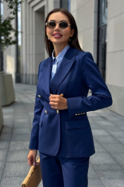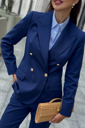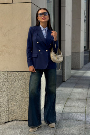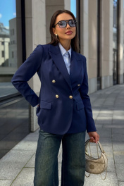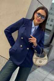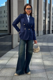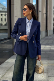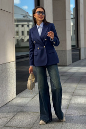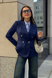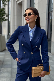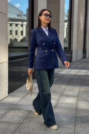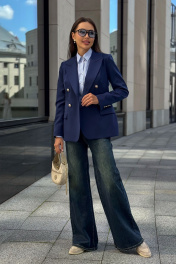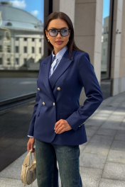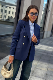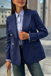 Каждая женщина знает: приталенный женский жакет способен выгодно подчеркнуть фигуру, добавить изящества и уверенности в себе. Синий цвет – это классика, которая никогда не выходит из моды. Такой жакет уместен как в офисе, так и на деловой встрече, на прогулке по городу или в вечернем образе. Жакет женский, полуприлегающего силуэта, выполнен из костюмной ткани, на притачной подкладке, с двубортной застежкой на 2 петли и 4 декоративные пуговицы (размер и цвет фурнитуры может незначительно отличаться от фото), для повседневной носки. Перед с закругленными по низу бортами, в нижней части с прорезными карманами с клапаном и обтачками, со смещенными рельефными швами от проймы до низа, с нагрудными вытачками, идущими от карманов вверх. Спинка с рельефными швами, средним швом и шлицей. Рукава втачные, двухшовные, длинные. В локтевом шве с отлетной шлицей с 4-мя петлями и 4-мя декоративными пуговицами. Горловина оформлена воротником пиджачного типа. Жакет с плечевыми накладками. "44 размер Длина жакета по среднему шву спинки – 66,0 см (±2,0 см), Ширина жакета на уровне глубины проймы – 48,0 см (±1,0 см), Ширина жакета на уровне линии талии – 42,0 см (±1,0 см), Ширина жакета на уровне линии бедра – 51,5 см (±1,0 см), Длина рукава жакета – 61,0 см (±1,0 см), Ширина рукава жакета вверху – 17,0 см (±1,0 см), Ширина рукава внизу - 12,0 см (±0,5 см), Длина плеча жакета – 11,8см (±0,5 см). 46 размер Длина жакета по среднему шву спинки – 66,0 см (±2,0 см), Ширина жакета на уровне глубины проймы – 50,0 см (±1,0 см), Ширина жакета на уровне линии талии – 44,0 см (±1,0 см), Ширина жакета на уровне линии бедра – 53,5 см (±1,0 см), Длина рукава жакета – 61,0 см (±1,0 см), Ширина рукава жакета вверху – 18,0 см (±1,0 см), Ширина рукава внизу - 12,0 см (±0,5 см), Длина плеча жакета – 11,8см (±0,5 см). 48 размер Длина жакета по среднему шву спинки – 66,0 см (±2,0 см), Ширина жакета на уровне глубины проймы – 52,0 см (±1,0 см), Ширина жакета на уровне линии талии – 46,0 см (±1,0 см), Ширина жакета на уровне линии бедра – 55,0 см (±1,0 см), Длина рукава жакета – 61,0 см (±1,0 см), Ширина рукава жакета вверху – 19,0 см (±1,0 см), Ширина рукава внизу - 12,5 см (±0,5 см), Длина плеча жакета – 12,0см (±0,5 см). 50 размер Длина жакета по среднему шву спинки – 68,0 см (±2,0 см), Ширина жакета на уровне глубины проймы – 54,0 см (±1,0 см), Ширина жакета на уровне линии талии – 49,0 см (±1,0 см), Ширина жакета на уровне линии бедра – 57,0 см (±1,0 см), Длина рукава жакета – 61,0 см (±1,0 см), Ширина рукава жакета вверху – 19,5 см (±1,0 см), Ширина рукава внизу - 13,0 см (±0,5 см), Длина плеча жакета – 12,0см (±0,5 см). 52 размер Длина жакета по среднему шву спинки – 68,0 см (±2,0 см), Ширина жакета на уровне глубины проймы – 56,0 см (±1,0 см), Ширина жакета на уровне линии талии – 51,0 см (±1,0 см), Ширина жакета на уровне линии бедра – 59,0 см (±1,0 см), Длина рукава жакета – 61,0 см (±1,0 см), Ширина рукава жакета вверху – 20,5 см (±1,0 см), Ширина рукава внизу - 13,5 см (±0,5 см), Длина плеча жакета – 12,2см (±0,5 см). 54 размер Длина жакета по среднему шву спинки – 68,0 см (±2,0 см), Ширина жакета на уровне глубины проймы – 58,0 см (±1,0 см), Ширина жакета на уровне линии талии – 53,0 см (±1,0 см), Ширина жакета на уровне линии бедра – 61,0 см (±1,0 см), Длина рукава жакета – 61,0 см (±1,0 см), Ширина рукава жакета вверху – 21,5 см (±1,0 см), Ширина рукава внизу - 14,0 см (±0,5 см), Длина плеча жакета – 12,2см (±0,5 см)."