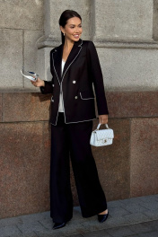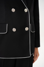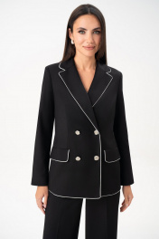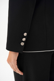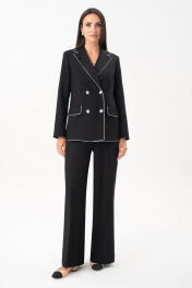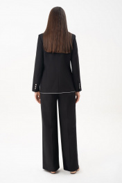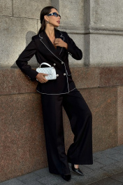 Женский брючный костюм URS — воплощение современного стиля, элегантности и уверенности. Этот черный костюм женский брючный создан для женщин, которые ценят безупречный внешний вид и классику в лучших традициях деловой моды. Элегантный жакет с серебристым кантом и аккуратными декоративными пуговицами придает образу изысканность и подчеркивает статус. Прямые брюки визуально вытягивают силуэт, создавая стройную и женственную линию. Костюм женский 2-х предметный, состоит из жакета и брюк, выполненных из костюмно-плательной ткани, для повседневной носки. Жакет свободного полуприлегающего силуэта, на подкладке, с двубортной застежкой на 2 петли и 4 металлические пуговицы (размер и цвет фурнитуры может незначительно отличаться от фото). Перед и спинка с отрезным бочком. Перед в нижних частях с прорезными карманами с клапаном и обтачкой, с талиевыми вытачками, с рельефными швами бочка. Клапаны по двум сторонам с отделочным серебристым кантом, концы клапанов слегка закруглены. Спинка со средним швом, с рельефными швами бочка. Рукава втачные, двухшовные, длинные. В локтевом шве по низу с отлетной шлицей с 3-мя петлями и пуговицами. Горловина оформлена воротником пиджачного типа. Концы воротника и лацкана закругленные. Воротник, лацканы, борта, низ переда и спинки обработан отделочным серебристым кантом. Жакет с плечевыми накладками. Брюки женские прямые от бедра, в размерах 46,48 на обтачном поясе, в размерах 50,52,54,56 с притачным поясом, с резинками на уровне боковых швов. По поясам с 5-ю шлевками, с застежкой на тесьму - «молнию», расположенную в среднем шве передних половинок. Пояс застегивается спереди на 1 пришивной потайной крючок, 1 петлю и потайную пуговицу (размер и цвет фурнитуры может незначительно отличаться от фото). Передние половинки брюк с боковыми наклонными карманами. Задние половинки брюк с талиевыми вытачками, идущих от пояса вниз. Брюки с заутюженными стрелками по передним и задним половинкам.
