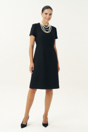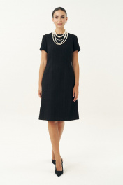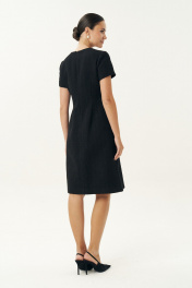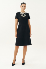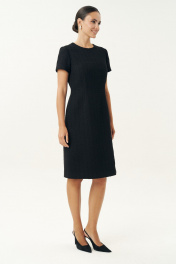 Неизменно, черное маленькое платье остается образцом элегантности… Платье женское, выполнено из костюмной твидовой ткани, полуприлегающего силуэта, расширенное к низу, на трикотажной подкладке притачной по низу переда и спинке, по низам рукавов. Платье повседневное. Перед с талиевыми вытачками, с нагрудными вытачками, идущими от боковых швов. Спинка с талиевыми вытачками, со средним швом, в верхней части которого обработана застежка на потайную тесьму-молнию. Рукава втачные, одношовные, короткие. Горловина переда и спинки обтачная, округлая.