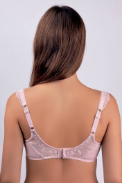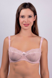 Бюстгальтер с мягкой чашкой на каркасах. Нижняя чашка с тройным членением на подкладке из сетки. Верхняя чашка кружевная. Стан из элатичной сетки с отделочными деталями из кружева на подкладке. Декор - кружево на бретелях.