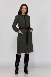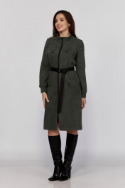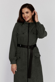 Платье женское, прямого кроя. Горловина со стойкой. Рукав длинный втачной, с манжетой на пуговице.По переду обработана планка с молнией. А также карманы клапаны. В области талии обработана кулиса с резинкой на сборку. Спинка со средним швом и кокеткой.