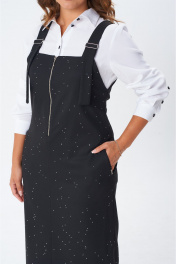 Комплект женский состоящий из сарафана и блузы. Сарафан прямого силуэта, без подкладки.Широкие бретели регулируются пряжкой. В верхней части переда молния. По спинке на уровне талии сборка на резинку. Средний шов переходит книзу в шлицу. Блуза из хлопковой ткани.Прямого силуэта. Воротник на стойке. Рукав втачной на манжете.По переду застежка на петли пуговицы. Спинка с кокеткой и средним швом.