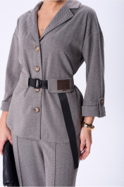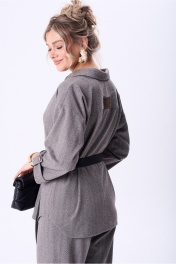 Комплект двойка состоит из жакета, и Брюк. Жакет свободного кроя.Рукав спущенный, свободного кроя с манжетой на пату. По переду застежка на петли пуговицы. По переду выполнены функциональные клапаны под пояс. Брюки классические, слегка зауженные к низу, карманы в боковых швах. На поясе с резинкой. В комплекте декоративный пояс.