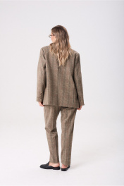 Жакет прямого силуэта. Воротник пиджачного типа.Застежка двубортная на петли пуговицы. По переду прорезной карман с клапаном. Втачной рукав, длинный. По рукаву декоративная шлица с пуговицами. Жакет на подкладке с плечевыми накладками.