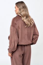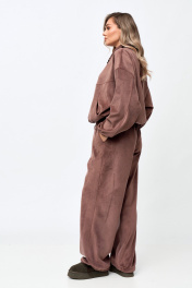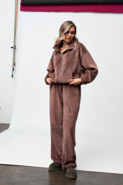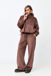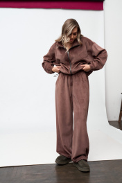 Костюм спортивный женский состоит из джемпера и брюк. Костюм выполнен из велюровой ткани в рубчик. Джемпер кроя “oversize” с воротником-стойкой и застежкой на молнию. Рукав спущенный, двухшовный. По низу рукава резинка. По переду отрезная фигурная кокетка, в рельефе карман. По низу джемпера есть кулиса с регулировкой. Брюки прямые на поясе с резинкой, крой “oversize”. Есть карманы в боковых швах. Ширина брюк по низу регулируется кулисой. Размер S/M соответствует размерам 44-48, M/L- 50-54 размеру.