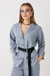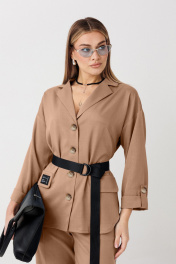 Комплект двойка состоит из жакета, и брюк. Жакет свободного кроя. Рукав спущенный, свободного кроя с манжетой на пату. По переду застежка на петли пуговицы и декоративные клапаны. Брюки классические, прямые, карманы в боковых швах. Брюки на поясе с резинкой. В комплекте декоративный пояс.