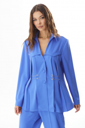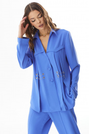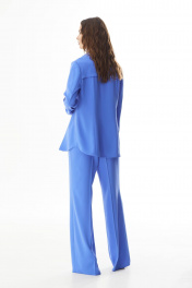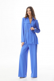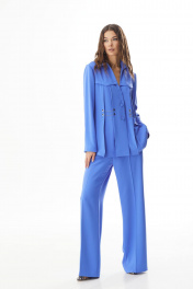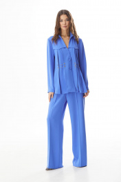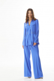 Комплект 2-х предметный: жакет и брюки. Костюм брючный из струящейся ткани. Жакет мягкой формы без подкладки. Застежка на петли и пуговицы и потайную кнопку. Вырез горловины V-образной формы. Воротник рубашечный. На переде кокетка фигурной формы и складки. Складки фиксируются декоративными цепочками в области талии. На спинке кокетка. Рукав прямой. Низ фигурной формы.Брюки прямые, свободной формы. Верх на поясе. Застежка по переду на молнию и пуговицу на поясе. В боковых швах карманы. На передних частях брюк клапаны фигурной формы с декоративными элементами. 44 р-р: жакет: ОГ - 98 см., ОТ - 90 см., ОБ - 102 см.; брюки: ОТ - 72 см., ОБ - 100 см. 46 р-р: жакет: ОГ - 102 см., ОТ - 94 см., ОБ - 106 см.; брюки: ОТ - 76 см., ОБ - 104 см. 48 р-р: жакет: ОГ - 106 см., ОТ - 98 см., ОБ - 110 см.; брюки: ОТ - 80 см., ОБ - 108 см. 50 р-р: жакет: ОГ - 110 см., ОТ - 102 см., ОБ - 114 см.; брюки: ОТ - 84 см., ОБ - 112 см. 52 р-р: жакет: ОГ - 114 см., ОТ - 106 см., ОБ - 118 см.; брюки: ОТ - 88 см., ОБ - 116 см.