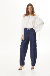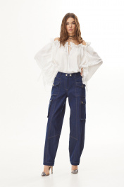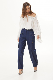 Брюки – карго из джинсовой ткани с широкими брючинами. Верх на притачном поясе. Застёжка на металлическую молнию, на петлю и пуговицу-болт. Спереди и сзади накладные карманы-портфели. Низ брюк на манжете, пата регулируется на петлю и пуговицы. 44 р-р: ОТ - 72 см., ОБ - 94 см. 44 р-р: ОТ - 76 см., ОБ - 98 см. 46 р-р: ОТ - 80 см., ОБ - 102 см. 48 р-р: ОТ - 84 см., ОБ - 106 см. 50 р-р: ОТ - 88 см., ОБ - 110 см. 52 р-р: ОТ - 92 см., ОБ - 114 см.
