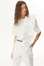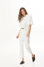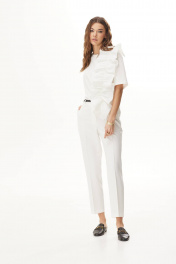 Комплект 2-х предметный: блузка и брюки.Блузка свободной формы из трикотажного полотна. Вырез горловины круглой формы. Рукава короткие. На переде декоративный элемент в виде оборки.Брюки средней “посадки”, зауженные к низу, с заутюженными стрелками. Верх брюк на притачном поясе 4,5 см с шлёвками, по боковым вставлены эластичная тесьма резинка. Спереди застёжка на тесьму-молнию, функциональные карманы в отрезном бочке. "44 р-р: блузка: ОГ - 112 см., ОТ - 110 см., ОБ - 116 см.; брюки: ОТ - 76 см. (в растянутом виде), ОБ - 96 см. 46 р-р: блузка: ОГ - 116 см., ОТ - 114 см., ОБ - 120 см.; брюки: ОТ - 80 см. (в растянутом виде), ОБ - 100 см. 48 р-р: блузка: ОГ - 120 см., ОТ - 118 см., ОБ - 124 см.; брюки: ОТ - 84 см. (в растянутом виде), ОБ - 104 см. 50 р-р: блузка: ОГ - 124 см., ОТ - 122 см., ОБ - 128 см.; брюки: ОТ - 88 см. (в растянутом виде), ОБ - 108 см. 52 р-р: блузка: ОГ - 128 см., ОТ - 126 см., ОБ - 132 см.; брюки: ОТ - 92 см. (в растянутом виде), ОБ - 112 см."