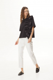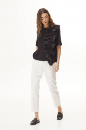 Комплект 2-х предметный: блузка и брюки.Блузка свободной формы из трикотажного полотна. Вырез горловины круглой формы. Рукава короткие. На переде декоративный элемент в виде оборки.Брюки средней “посадки”, зауженные к низу, с заутюженными стрелками. Верх брюк на притачном поясе 4,5 см с шлёвками, по боковым вставлены эластичная тесьма резинка. Спереди застёжка на тесьму-молнию, функциональные карманы в отрезном бочке. "44 р-р: блузка: ОГ - 112 см., ОТ - 110 см., ОБ - 116 см.; брюки: ОТ - 76 см. (в растянутом виде), ОБ - 96 см. 46 р-р: блузка: ОГ - 116 см., ОТ - 114 см., ОБ - 120 см.; брюки: ОТ - 80 см. (в растянутом виде), ОБ - 100 см. 48 р-р: блузка: ОГ - 120 см., ОТ - 118 см., ОБ - 124 см.; брюки: ОТ - 84 см. (в растянутом виде), ОБ - 104 см. 50 р-р: блузка: ОГ - 124 см., ОТ - 122 см., ОБ - 128 см.; брюки: ОТ - 88 см. (в растянутом виде), ОБ - 108 см. 52 р-р: блузка: ОГ - 128 см., ОТ - 126 см., ОБ - 132 см.; брюки: ОТ - 92 см. (в растянутом виде), ОБ - 112 см."