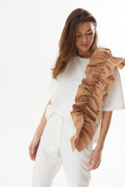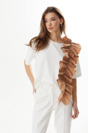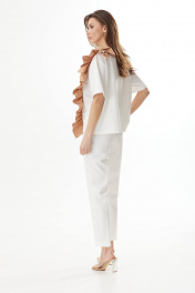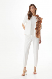 Комплект 2-х предметный: блузка и брюки.Блузка свободной формы из трикотажного полотна. Вырез горловины круглой формы. Рукава короткие. На переде декоративный элемент в виде оборки.Брюки средней “посадки”, зауженные к низу, с заутюженными стрелками. Верх брюк на притачном поясе 4,5 см с шлёвками, по боковым вставлены эластичная тесьма резинка. Спереди застёжка на тесьму-молнию, функциональные карманы в отрезном бочке. "44 р-р: блузка: ОГ - 112 см., ОТ - 110 см., ОБ - 116 см.; брюки: ОТ - 76 см. (в растянутом виде), ОБ - 96 см. 46 р-р: блузка: ОГ - 116 см., ОТ - 114 см., ОБ - 120 см.; брюки: ОТ - 80 см. (в растянутом виде), ОБ - 100 см. 48 р-р: блузка: ОГ - 120 см., ОТ - 118 см., ОБ - 124 см.; брюки: ОТ - 84 см. (в растянутом виде), ОБ - 104 см. 50 р-р: блузка: ОГ - 124 см., ОТ - 122 см., ОБ - 128 см.; брюки: ОТ - 88 см. (в растянутом виде), ОБ - 108 см. 52 р-р: блузка: ОГ - 128 см., ОТ - 126 см., ОБ - 132 см.; брюки: ОТ - 92 см. (в растянутом виде), ОБ - 112 см."