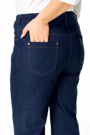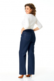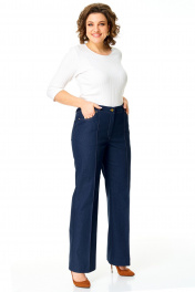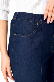 Брюки прямого силуэта с центральной застёжкой на молнию и петлю-пуговицу. По передним половинкам застрочены канты.В боковых швах карманы с отрезным бочком.Задние половинки с отрезными кокетками и накладными карманами. Застежка спереди на молнию и пуговицу. Пояс притачной с резинками по бокам. Отделочные строчки контрастного цвета