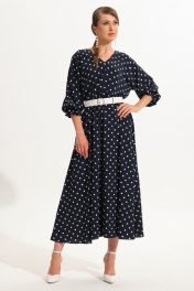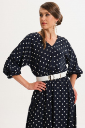 Платье женское расклешённого силуэта отрезное по талии. Отрезной пояс платья собран на резинку "венгерка" для прилегания по линии талии. Горловина переда V-образная. Рукава цельнокроеные с кулисой и вставленной в нее резинкой. Имеется навесной пояс из основной ткани. В боковых швах имеются карманы.