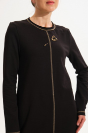 Платье свободного покроя, прямого силуэта.В боковых выполнены разрезы. Рукав втачной одношовный. Горловина округлой формы.Обработана бейкой с сырыми срезами и отделочной строчкой контрастными нитками.Спинка и перед со средними швами, обработаны сырыми срезами и отделочной строчкой контрастными нитками.Имеется декоративная брошь.