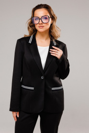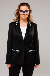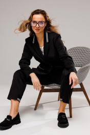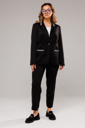 Костюм женский, состоит из жакета и брюк. Жакет полуприталенного силуэта, с естественной линией плеча. Перед на подкладке. Центральная однобортная застёжка на 1 петлю-пуговицу. Воротник пиджачного типа. Спинка со средним швом и рельефами из пройм. На полочках выполнены рельефы из пройм и прорезные карманы с листочками из довяза. Воротник выполнен из довяза. Рукав втачной двухшовный. Брюки зауженные к низу, с центральной застёжкой на молнию и петлю-пуговицу. В боковых швах карманы. Пояс притачной с резинкой по бокам. Понизу задних половинок вставлен довяз.