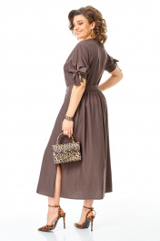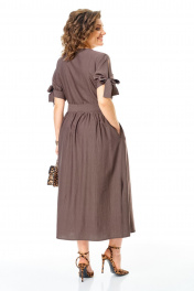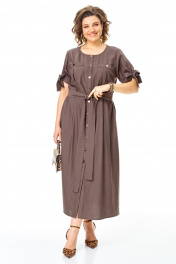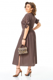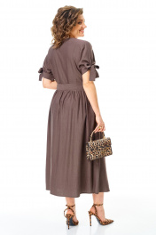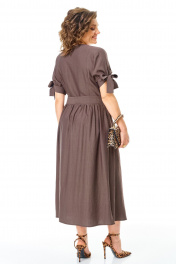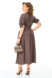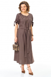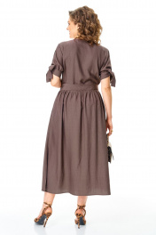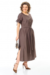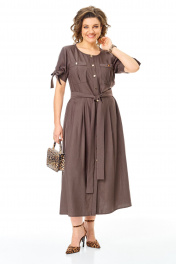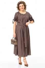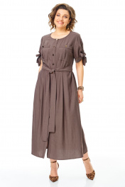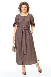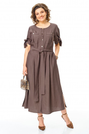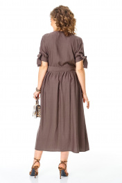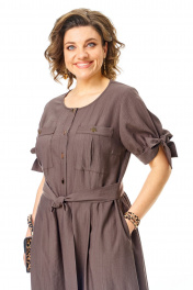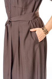Платье женское свободного покроя с легким расклешением к низу и естественной линией плеча.Рукав втачной с разрезом в верхнем шве и манжетой переходящей в завязки.Горловина округлой формы.Перед с отрезной планкой, застежкой на петли-пуговицы, вытачками переходящими в складку и нагрудными карманами.Спинка с подрезом ниже линии талии, сборкой в нижней части и втачным поясом переходящим в завязки.В боковых швах обработаны карманы.