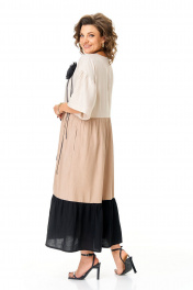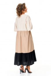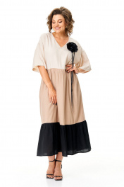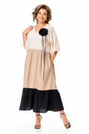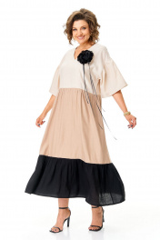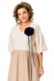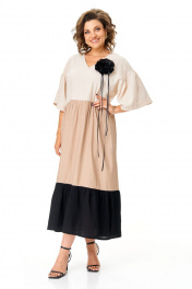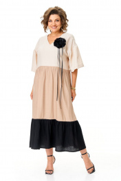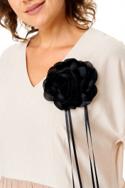 Платье женское А-образного силуэта со спущенной линией плеча.По окату рукава обработана сборка.Горловина V-образной формы.В среднем шве спинки застежка на тесьму-молнию.Перед и спинка выполнена последовательными оборками создающими легкое расклешение низу.Платье состоит из разных цветов ткани.В боковых швах обработаны карманы.В комплект входит съемная брошь в виде цветка.