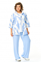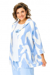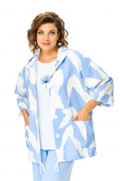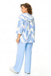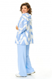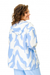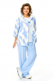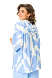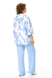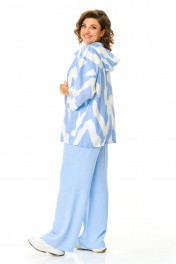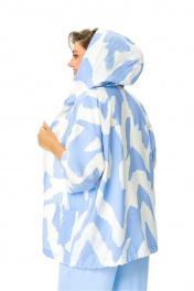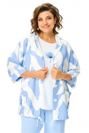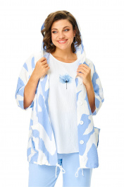Костюм женский состоит из бомбера, топа и брюк. Бомбер из принтованной ткани свободного покроя со спущенной линией плеча.Центральная застёжка на петли пуговицы.В горловину вставлен капюшон.Низ бомбера с кулисой и шнуром.Рукав длиной 3/4 с манжетой.Топ свободного покроя.Горловина округлой формы, окантована.Рукав спущенный цельнокроеный.Брюки свободные прямого силуэта.Пояс притачной на резинке.В боковых швах карманы.