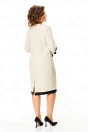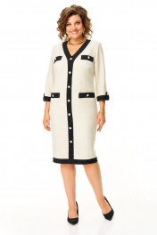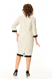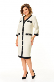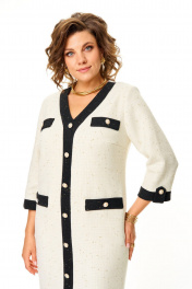 Платье прямого силуэта с естественной линией плеча на трикотажной подкладке.Спинка со средним швом и застежкой на молнию.Перед с нагрудными вытачками и отделочными настрочными листочками.По переду обработана отделочная отрезная планка.Вырез горловины V-образной формы.Рукав втачной одношовный длиной 3/4 с отделочной планкой по низу и патой.На изделие пришиты декоративные пуговицы.Ткань с добавлением шерсти, ворсистой фактуры с вплетением металлизированной нити.