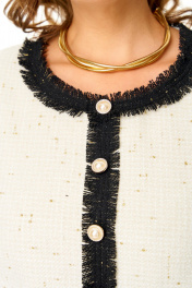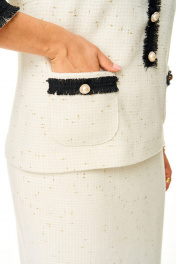 Платье прямого силуэта с естественной линией плеча на трикотажной подкладке.Платье выполнено имитацией жакета и юбки карандаш.Спинка со средним швом и застежкой на молнию. Перед с нагрудными вытачками и накладными карманами.Вырез горловины округлой формы.По горловине и переду настрочены отделочные бейки с необработанным краемРукав втачной одношовный длиной 3/4.По низу рукава настрочена отделочная бейка с необработанным краем.На изделие пришиты декоративные пуговицы.Ткань с добавлением шерсти, ворсистой фактуры с вплетением металлизированной нити.