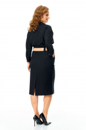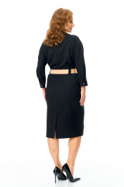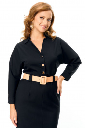 Платье женское полуприлегающего силуэта, заужено к низу.Рукав цельнокроеный типа "летучая мышь" длиной 3/4. Низ рукава обработан притачной манжетой с застежкой на петлю-пуговицу.Горловина обработана блузочным воротником на отрезной стойке.Спинка со средним швом и вытачками.Средний шов спинки с застежкой на тесьму-молнию и шлицей.Перед, до линии талии, с однобортной застежкой на петли-пуговицы.Имеется отделочный навесной пояс контрастного цвета.Для поддержания пояса на линии талии обработаны шлёвки.По переду обработаны карманы с отрезным бочком.