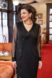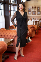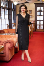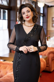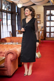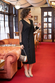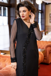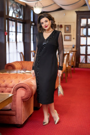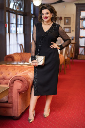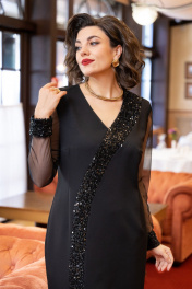 Платье полуприлегающего силуэта с естественной линией плеча с лёгким заужением по низу.Спинка со средним швом, талиевыми вытачками и застежкой на молнию.Перед с нагрудными и талиевыми вытачками.По переду обработана отделочная отрезная планка из полотна с пайетками.Для комфорта и практичности носки в шве притачивания планки переда обработана шлица.Вырез горловины V-образной формы.Рукав втачной одношовный длинный, выполнен из эластичной сетки.Низ рукава обработан манжетой из полотна с пайетками.