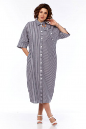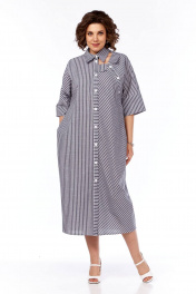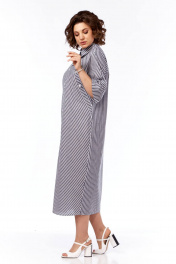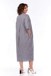 Платье свободного силуэта из ткани в полоску. Горловина обработана воротником, застежка на петли пуговицы, на левой полочке отделочный элемент с воротником и планкой, на планке пришиты пуговицы ( пуговицы не расстегиваются) Рукав спущенный низ рукава обработан манжетом, по спинке по среднему шву складка .В правом боковом карман. Обмеры готового изделия: Ог= 50р=120см 52р=124см 54р =128см Длина рукава от точки втачивания воротника=52см для всех размеров Длина платья по спинке =122см для всех размеров.