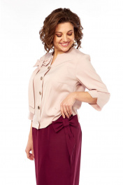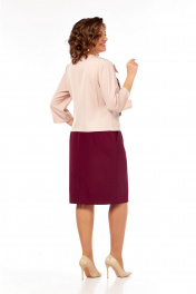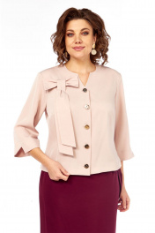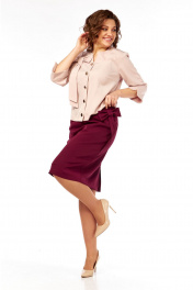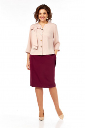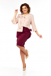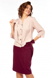 Комплект женский Жакет + юбка свободного силуэта. По переднем половинкам жакета нагрудная выточка,горловина обработана обтачкай, застежка на петли пуговицы рукав втачной, по низу рукава небольшой разрез.Спинка с средним швом. На правой половинке жакета настрочен отделочный элемент «бант» Жакет без подкладки. Юбка на подкладке в боковых швах карманы,по левой половинке в области кармана отделочный элемент «бант»по задней половинке разрез и застежка на молнию , верхний срез обработан поясом по задней половинке пояса вставлена резинка.