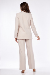 Костюм женский 3-х предметный, полуприлегающего силуэта. Состоит из жакета и жилета на подкладке и брюк. Жакет с воротником пиджачного типа, центральной застёжкой на 1 петлю и 1 пуговицу. Перед с рельефными швами от пройм до низа и талиевыми вытачками и прорезными карманами с листочками с втачными концами. Спинка со средним швом. Рукав втачной, двухшовный, длинный со шлицей. Жилет с рельефными швами от пройм до низа по переду и спинке, с центральной застёжкой на 4 петли и 4 пуговицы. Перед с прорезными карманами с листочками с втачными концами. Брюки с застёжкой на тесьму "молнию" в средних срезах передних половинок, с притачным поясом на 1 петлю и 1 пуговицу и резинкой по задним половинкам, с карманами наклонными к боковым швам. По передним и задним половинкам заутюженные канты. Длина жакета по спинке - 71 см. Длина рукава - 61 см. Длина жилета по спинке - 54 см. Длина брюк по боковому шву - 101 см.