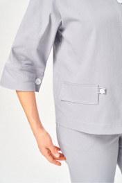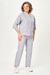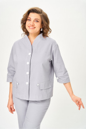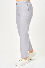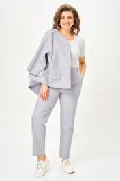 Костюм женский двухпредметный, состоящий из жакета и брюк. Жакет прямого слуэта, с центральной бортовой застежкой на 4 петли-пуговицы, с цельнокройной стойкой. По переду изделия пришиты 2 клапана с патой и одной пуговицей из отделочной ткани. Спинка со средним швом и нашивкой, настроченной по низу изделия. В изделии спущена линия проймы. Рукав одношовный длиной 3/4 с притачным манжетом и с разрезом по шву, с пришивной пуговицей. Изделие без подкладки, обтачка горловины спинки из отделочной ткани. Брюки заужены к низу за счет вытачки по низу передних половинок. Изделие с притачным поясом сзади на резинке, а также с патой с петлей и двумя пуговицами по поясу передних половинок для лучшей фиксации по талии. Брюки с карманом наклонной формы и с застежкой на одну петлю-пуговицу и тесьму-молнию в средних срезах передних половинок. На задних половинках обработана фигурная кокетка и накладной карман.