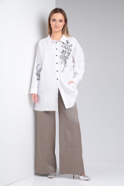 Рубашка женская из хлопка с эластаном. Свободного кроя , застегивается на застежку пуговицы по переду. Рукав с притачным манжетом . Спущенное плечо. По преду на левой полочке выполнена черная вышивка. На правом рукаве также выполнена в том же стиле вышивка.