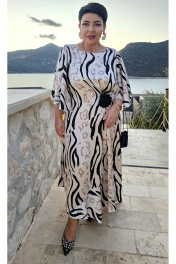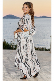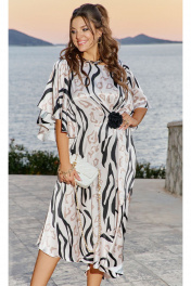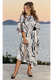 Шикарное платье с принтом в модном анималистическом стиле - для приверженцев ярких и стильных образов. Ткань из высококачественной вискозы атласного переплетения - мягкая, приятная к телу, имеет матовый благородный блеск. Следуя оригинальному крою, нежная вискоза создает красивые мягкие встречные складки по талии, а от бедер элегантно струится вниз, скрывая несовершенства фигуры, создает гармоничный образ. Графичный зебровый принт скрадывает объем и визуально вытягивает силуэт.По талии платье декорировано съемной брошью в форме цветка. Это изысканное платье преобразит любую женщину, подчеркнет природную красоту и изящество! Платье макси с втачными коническими рукавами длиной чуть ниже локтя. Прилегание по талии достигается мягкой бантовой складкой по переду. От бедер платье расширяется книзу. Горловина круглая. Длина платья от высшей точки плечевого шва до низа 129 см. Длина рукава 35 см. платье 50 52 54 56 58 60 обхват груди 104 108 112 116 120 124 обхват талии 106 106 106 118 118 118