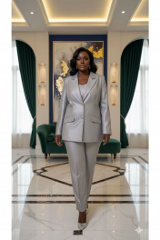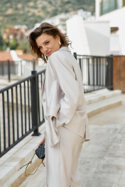 Ткань с мерцающим отливом, не кричащим, а лишь намёком напоминающим о вечернем свете. Это костюм для женщины, которая ценит безупречность линий, но не боится лёгкого сияния. Он струится по фигуре, как жидкий шёлк, переливаясь при каждом движении — элегантный, сдержанный, но не лишённый изысканной роскоши. Жакет свободного силуэта с центральной застёжкой на петлю-пуговицу по краю борта, отложными лацканами и воротником пиджачного типа и отрезными бочками. По переду жакета талиевые вытачки и прорезные карманы с клапаном. Спинка в жакете со средним швом заканчивающимся отлетной шлицей. Рукав втачной, длинный, двухшовный с декоративной шлицей фиксирующейся на декоративную пуговицу. Жакет на подкладке. Брюки прямого силуэта с застроченными стрелками по переду, с застежкой на тесьму молнию в гульфике и пуговицу в поясе. По переду брюк наклонные карманы. Пояс притачной с декоративными шлёвками и вставкой эластичной тесьмы резинки в «бочках», что обеспечивает комфортную посадку на фигуру. Обращаем Ваше Внимание, что фурнитура может незначительно отличаться от фото. Длина жакета по спинке 72 см. Длина рукава жакета 62 см. Длина брюк по боковому шву 98 см. Жакет 50 52 54 56 58 60 обхват груди 110 114 118 122 126 130 ширина рукава вверху 38 40 42 42 44 46 ширина изделия внизу 120 124 128 132 136 140
