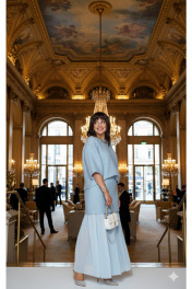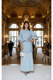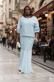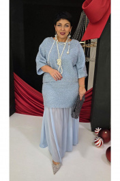 Это стильный и современный юбочный костюм, созданный для особого случая. Он состоит из трёх частей: блузы, верхней и нижней юбки. Основу ткани составляет роскошный твид голубого цвета с металлическим блеском, в который искусно вплетена деликатная люрексовая нить, придающая полотну благородное мерцание. Он не только подчеркивает достоинства фигуры, но и дарит ощущение комфорта и роскоши. Блуза (состав: 43% акрил, 32% пэ, 23% хлопок, 2% люрекс, подкладка 100% полиэстер.) свободного силуэта, выполненная из плотной, фактурной ткани с серебристым блеском. Её простой крой с широкими рукавами создаёт расслабленный силуэт. Горловина в блузе округлой формы, по переду нагрудные вытачки. Спинка без особенностей. Рукав длиной ¾, широкий, фигурной формы с застроченной складкой. Низ в блузе ассиметричный. Юбка представляет собой многослойную конструкцию: верхний слой выполнен из той же блестящей ткани, что и блуза, и имеет прямой силуэт мини-длины. Нижний слой — это длинная, струящаяся юбка-макси из полупрозрачного, лёгкого шифона серого цвета. Такое сочетание фактур и длин создаёт интересный и динамичный образ. Верхняя юбка (состав: 43% акрил, 32% пэ, 23% хлопок, 2% люрекс, подкладка 100% полиэстер.) длины мини, прямого силуэта с притачным поясом со вставкой эластичной тесьмы- резинки в бочках. В среднем шве юбки застёжка на потайную тесьму-молнию и пуговицу в поясе. Юбка на подкладке. Нижняя юбка (состав: 100% полиэстер) длины миди, со сборкой на резинку по верхнему срезу, с притачным воланом со сборкой от подреза. Длина блузы по спинке 59,5 см (р 50-54), 60,5 см (р 56-60), длина рукава 28,5 см. Длина юбки 106 см (р 50-54), 107 см (р 56-60). Нижняя юбка 44 см (р 50-54), 45 см (р 56-60) Блуза 50 52 54 56 58 60 ширина на уровне проймы 118 122 126 130 134 138 ширина на уровне бедер (по низу) 123 127 131 135 139 143 ширина рукава вверху 48 50 52 52 54 56 Верхняя юбка 50 52 54 56 58 60 ширина по талии 70/118 74/126 78/126 82/130 86/134 90/138 обхват бедер 24 128 132 136 140 144 Нижняя юбка 50 52 54 56 58 60 ширина по талии 80/96 84/100 88/104 92/108 96/112 100/116 обхват бедер 119 123 127 131 135 139 ширина пояса 4 4 4 4 4 4