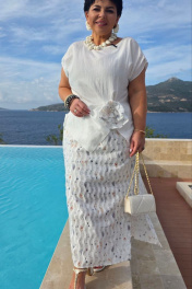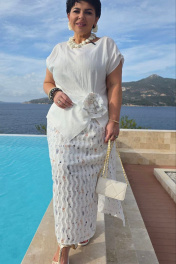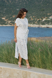 Комплект летний женский двусоставной для повседневной носки и торжественных случаев. Комплект небольшого объема полуприлегающего силуэта по геометрическому подобию напоминает прямоугольник, пластическая форма мягкая, плавная. Блуза свободного покроя с спущенным цельнокроенным рукавом. По плечевой линии выполнены кокетливые декоративные защипы. В линии талии сбоку выполнен декоративно-конструктивный подрез с выходящими из него складками. Линия низа фигурная с углами по переду. На подрезе съемный декоративный элемент в виде цветка из ткани юбки гармонично связывающий композицию и притягивающий внимание к талии. Фигурное решение линии низа визуально вытягивает фигуру, а мягкий крой линий придаст свободу каждом движению. Линия низа спинки ровная, в боковых швах небольшие разрезы. Юбка прямого силуэта из фактурного материала с декоративным фигурным рисунком, выложенным вертикальными линиями, визуально вытягивающими фигуру, в боковых швах разрезы, благодаря которым изделие не сковывает движения, а притачной пояс на резинке по всей длине придает особый комфорт. Юбка на подкладке из 100% натурального хлопка. Этот женский костюм свободного кроя в верхней части и стройнящей юбки внизу создан сделать ваш летний образ удобным и придать уверенности в каждом движении. В нем будет комфортно в любом месте, как на прогулке, встрече, так и торжественном мероприятии. Его идеальная посадка и натуральные ткани, подобранные с любовью к женщине. Комплект станет любимым и займет достойное место в летнем гардеробе на несколько сезонов вперед. Длина блузки 60 см (р 50-54), 61 см (р 56-60). Длина рукава 21 см (р 50-54), 23 см (р 56-60). Длина юбки 88 см. Блузка 50 52 54 56 58 60 обхват груди 112 116 120 126 130 134 обхват бедер 120 124 128 132 136 140 Юбка 50 52 54 56 58 60 ширина по талии 78/112 82/116 86/120 90/124 94/128 98/132 обхват бедер 120 124 128 132 136 140 ширина пояса 4 4 4 4 4 4