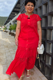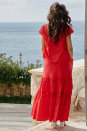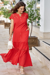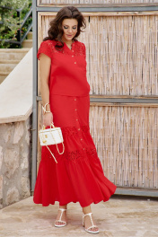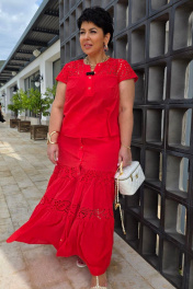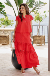Стильный и летний костюм - идеальный вариант для тех, кто любит привлекать внимание. Практичный и элегантный, он поможет создать образ, который будет отлично смотреться в летнюю жару. Костюм женский, состоящий из блузки и юбки. Блузка прямого силуэта, по переду горловина с фигурным вырезом и фигурной планкой на петли и пуговицы и нагрудными вытачками. По переду и спинке блузки кокетка фигурной формы из отделочной ткани ришелье. Низ в блузке ассиметричный, фигурной формы с разрезами в боковых швах. Рукав втачной, короткий - крылышко. Юбка длины макси, с притачным поясом со шлёвками, вставкой из эластичной тесьмы-резинки по спинке юбки. По переду юбки планка с застёжкой на петли и пуговицы и наклонные карманы. Воланы в юбке чередующиеся, с вышивкой ришелье и однотоном со сборкой от подреза. Юбка на подкладке. Длина блузки 57 см (р 50-54), 58 см (р 56-60), длина рукава 12,5 см (р 50-54), 13,5 см (р 56-60). Длина юбки 101 см. Блузка 50 52 54 56 58 60 обхват груди 111 115 119 123 127 131 обхват бедер 117 121 125 129 133 137 Юбка 50 52 54 56 58 60 ширина по талии 76/96 80/100 84/104 88/108 92/112 96/116 обхват бедер 118 122 126 130 134 138 ширина пояса 4 4 4 4 4 4