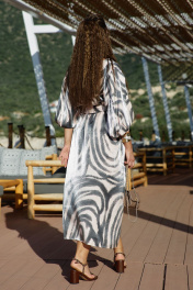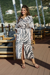 Шикарное платье с зебровым принтом и «театральными» рукавами в духе коллекций от-кутюр позволит своей обладательнице выделиться из толпы, привлечь восхищенные взгляды и быть в центре внимания на любом мероприятии! Платье выполнено из инновационной вискозной ткани с благородным матовым блеском, которая хорошо держит форму и слабо мнется. Принт в виде акварельной интерпретации анималистических мотивов – тренд сезона! Это изысканное платье преобразит любую женщину- подчеркнет все, что нужно подчеркнуть, и скроет все, что нужно скрыть! Платье длинное, прямого силуэта, с V-образной горловиной. Втачные рукава длиной до локтя. Пышная форма рукавов достигается глубокими складками сложной формы, которые по низу фиксируются подкладкой. По переду платья - средний шов, переходящий в разрез. При желании, платье можно по талии зафиксировать поясом. Длина платья от высшей точки плечевого шва до низа 131 см. Длина рукава 37 см по короткой стороне. Длина рукава 45 см по длинной. Платье 50 52 54 56 58 60 обхват груди 119 123 127 131 135 139 обхват бедер 121 125 129 133 137 141 ширина рукава вверху (по подкладке рукава) 44 46 48 48 50 52