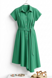 Это изысканное женское платье, выполненное в одном цвете. Платье приталенного силуэта, который подчеркивает фигуру, её изящество и плавные линии. Верхняя часть создаёт утончённый силуэт, акцентируя внимание на талии придавая образу кокетливую легкость. Платье приталенного силуэта с центральной застёжкой на петли пуговицы по планке, воротником рубашечного типа. Линия плеча спущенная с притачной манжетой по низу, плечевой шов переходит на полочку. Платье отрезное по талии со и вставкой эластичной тесьмы резинки, которая обеспечивает максимально удобное прилегание; по правой детали лифа платья накладной карман. По левой детали платья заложена декоративная складка. От бокового шва платья в круговую с переходом на перёд пояс из основной ткани со вставкой эластичной тесьмы резинки, фиксируется на талии при помощи кнопки. Спинка платья с отрезной кокеткой, и вставкой эластичной тесьмы резинки, которая обеспечивает максимально удобное прилегание по талии. Юбка платья трапециевидного силуэта с ассиметричным низом, в боковых швах карманы. Обращаем Ваше внимание, что фурнитура может незначительно отличаться от фото. Длина платья от плечевого шва 113 см. Ширина плеча 25 см (р.48-52), 27 см (р.54-58) Платье 48 50 52 54 56 58 обхват груди 104 108 112 116 120 124 обхват бедер 82/92 86/96 90/100 94/104 98/108 102/112 ширина рукава внизу 38 38 38 41 41 41