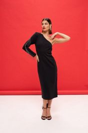 Платье женское, полуприлегающее. Выполнено из высококачественной трикотажной ткани. Горловина ассиметричная, с одним втачным рукавом. Который состоит из двух частей, между которыми вставлена отделочная металлическая тесьма. Перед с нагрудными и талиевыми вытачками. Спинка разрезная, в которой втачена потайная тесьма молния. В боковом шве изделия-разрез. Длина рукава-60.5 Длина изделия-116.8