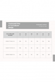 Рубашка женская, прямого силуэта со спущенным плечом. Перед из двух частей с центральной бортовой застежкой на 5 петель, пуговиц и двумя карманами. Спинка цельная. Рукав с притачной манжетой, застегивающейся на 2 петли и пуговицы. Воротник рубашечного типа на стойке. Длина изделия (р.44, 46, 48): 51,5 см. Длина изделия (р.50, 52, 54): 54 см. Длина рукава: 62 см. Уход: ручная стирка при температуре не выше 30 С.