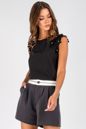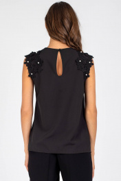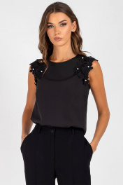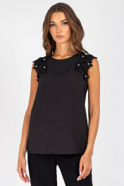 Блузка женская полуприлегающего силуэта. Перед цельный с нагрудными выточками. Спинка цельная с капелькой и застежкой на навесную петлю и пуговицу. Отделочным элементом блузы является кружево, настроченное на верхней части переда и спинки. На кружево пришиты бусины. Длина изделия в размерах 44, 46, 48: 60 см. Длина изделия в размерах 50, 52, 54: 62 см. Уход: бережная стирка при температуре не выше 30°С.