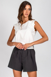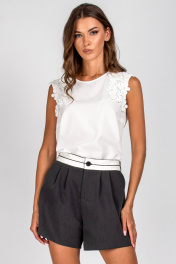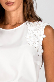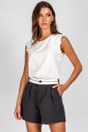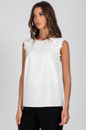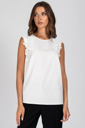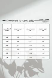 Блузка женская полуприлегающего силуэта. Перед цельный с нагрудными выточками. Спинка цельная с капелькой и застежкой на навесную петлю и пуговицу. Отделочным элементом блузы является кружево, настроченное на верхней части переда и спинки. На кружево пришиты бусины. Длина изделия в размерах 44, 46, 48: 60 см. Длина изделия в размерах 50, 52, 54: 62 см. Уход: бережная стирка при температуре не выше 30°С.