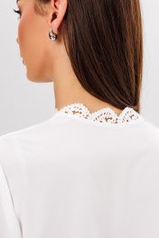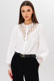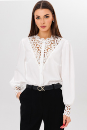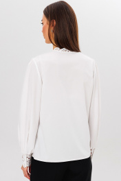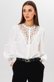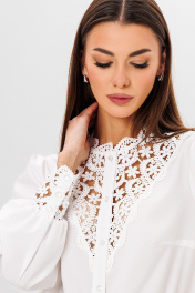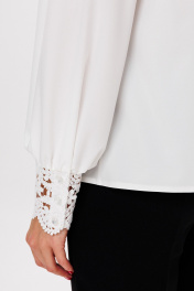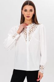 Женская блузка полуприлегающего силуэта. Передняя часть блузки с нагрудными вытачками, что подчеркивает женственность силуэта. Центральная бортовая застежка, выполненная из изысканного кружевного материала, добавляет нарядности и утонченности образу, создавая акцент на декольте. Спинка блузки цельная, что придает изделию гармоничность и элегантность. Горловина оформлена притачной стойкой из того же кружевного материала, что создает завершенный и стильный вид. Рукава втачные со сборкой как по окату, так и по низу, что придаёт образу лёгкость и романтичность. Низ рукава дополнен притачной манжетой из кружева, застегивающимся на три петли и пуговицы, что вносит дополнительный элемент изящества в дизайн. Материалы, используемые для этой блузки, обеспечивают комфорт. Эта блузка будет отличным выбором как для повседневного ношения, так и для более официальных мероприятий благодаря своему элегантному дизайну. Кружевные детали придают модели особую актуальность для торжественных случаев и вечерних мероприятий. Уход: бережная стирка при температуре не выше 30°С.