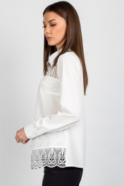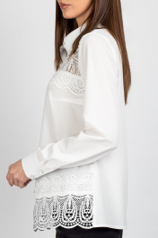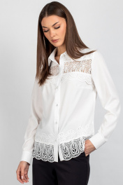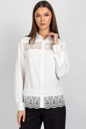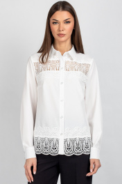 Женская блузка полуприлегающего силуэта, сочетающая строгость кроя с изысканными акцентами. Передняя часть c нагрудными выточками, обеспечивающими комфортную посадку. Центральная бортовая застёжка — на 6 или 7 пуговиц (в зависимости от размера), придаёт образу классическую завершённость. Особое внимание привлекает кружево, изящно нашитое в верхней и нижней части переда — оно добавляет лёгкости и утончённости, делая блузку особенно женственной. Спинка цельнокроеная, без дополнительных швов, что подчёркивает чистоту силуэта. Рукава втачные, с элегантной линией плеча. Низ рукава оформлен притачной манжетой, застёгивающейся на две пуговицы — аккуратный акцент, подчёркивающий запястья и гармонирующий с кружевными деталями. Воротник рубашечного типа с отрезной стойкой — строгий, но изящный элемент, который придаёт изделию архитектурную чёткость и завершённость. Его форма удачно балансирует между классикой и романтичным стилем. Уход: бережная стирка при температуре не выше 30°С.
