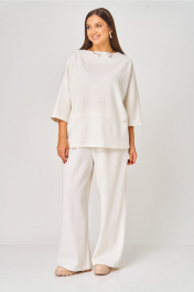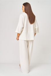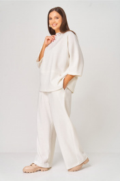 Джемпер: – свободный силуэт – горловина «лодочка» – спущенный рукав 1/4 – декоративное украшение Брюки: – прямой силуэт – пояс с эластичной тесьмой – карманы в боковых швах.