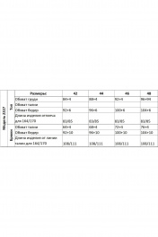 Костюм женский, состоящий из удлиненного топа и брюк. Топ на тонких бретелях, расклешенный к низу, с высокими разрезами по бокам. Длина топа по спинке от плеча 83 см для роста 164 см, 85 см для роста 170 см. Брюки широкие от бедра, в боковых швах карманы. Пояс притачной, на резинке по задней половинке. Застежка – гульфик на молнии. Длина брюк от пояса 108 см для роста 164 см, 111 см для роста 170 см.