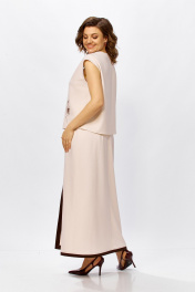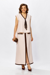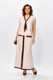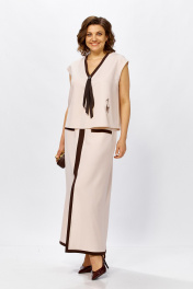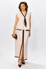 Этот стильный комплект — воплощение современной классики и комфорта. Лаконичный дизайн в сочетании с натуральной фактурой материала делает его идеальным выбором как для офисного гардероба, так и для торжественных мероприятий или городских прогулок в теплый сезон. Блуза свободного кроя без рукавов с изящным V-образным вырезом. Контрастная отделка по горловине и центральной линии визуально вытягивает силуэт, а декоративный элемент в виде завязок добавляет образу женственности. Юбка прямого фасона длины макси. Акцентная вертикальная вставка спереди завершается эффектным разрезом, который обеспечивает свободу движений и подчеркивает линию ног. Карманы с контрастным кантом поддерживает общую стилистику костюма. Ткань-льносодержащее полотно обладает уникальной терморегуляцией — в таком костюме будет комфортно даже в жаркий день. Добавление смесовых волокон делает ткань более практичной: она меньше мнется и лучше держит форму по сравнению со 100% льном. Преимущества- дышащая ткань,высокая воздухопроницаемость и гигроскопичность. Универсальность- элементы костюма можно носить как вместе, так и раздельно, создавая десятки новых образов. Стильный контраст- сочетание молочного/бежевого оттенка с темной отделкой выглядит благородно и дорого.